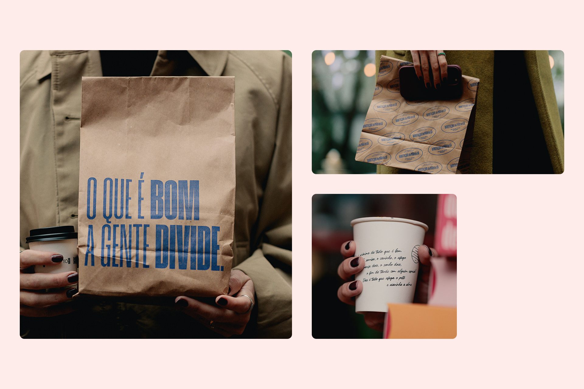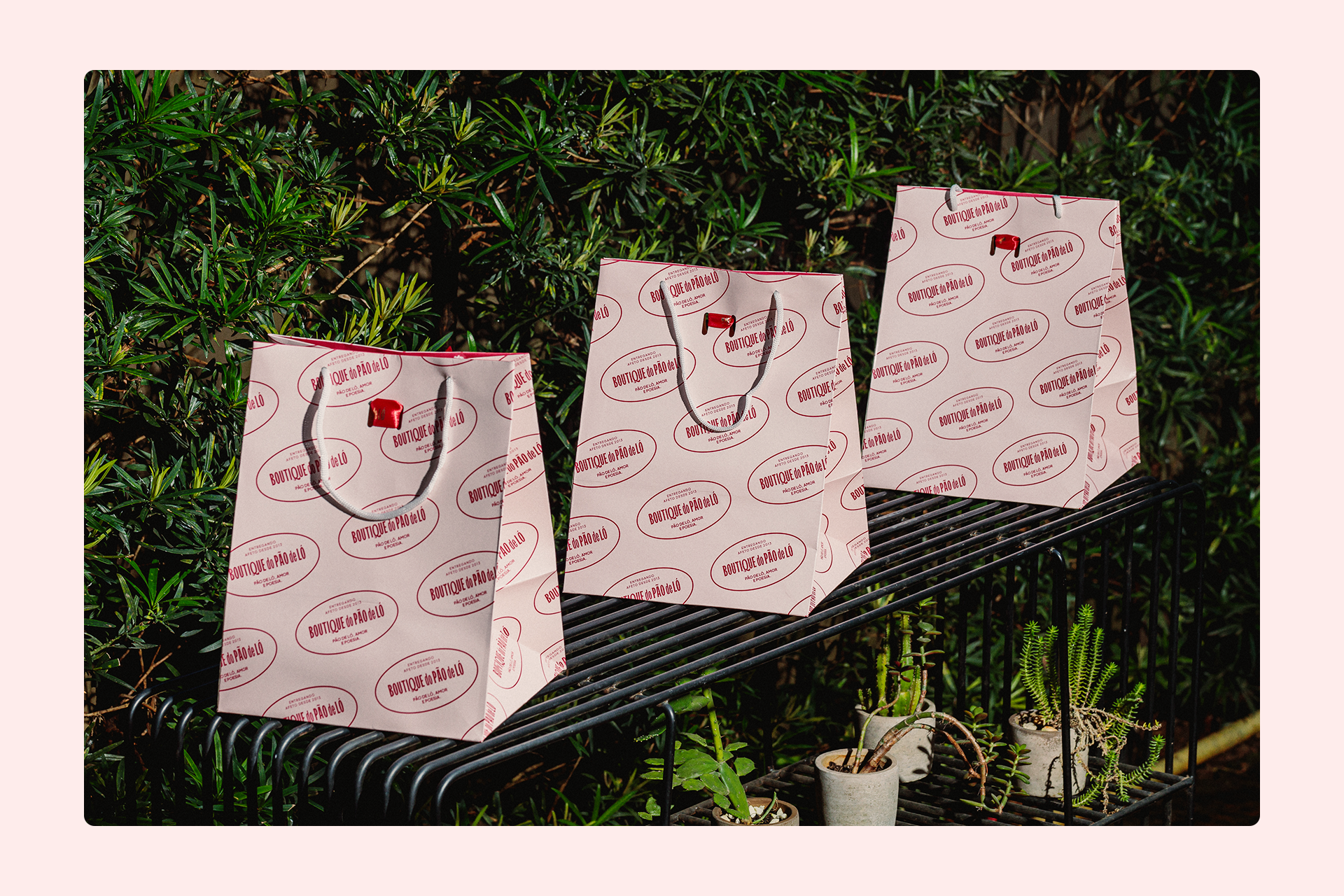 No que diz respeito à identidade visual, identificamos um desafio: o nome Boutique do Pão de Ló, apesar de forte, é extenso e apresentava limitações em suas aplicações. Pensando nisso, redesenhamos a tipografia, optando por uma versão mais condensada. Também exploramos detalhes tipográficos como inktraps e a cauda da letra "Q", conferindo à marca mais personalidade e versatilidade nas aplicações.