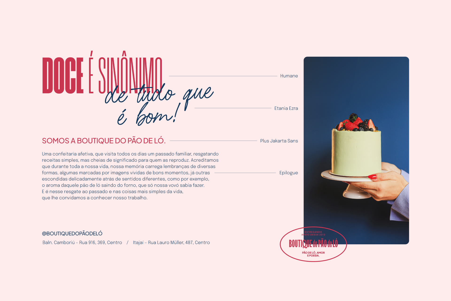 Por se tratar de uma marca já consolidada na região, identificamos a importância de resgatar sua trajetória, revisitando elementos visuais, textuais e verbais utilizados ao longo dessa década. A partir desse resgate, realizamos atualizações alinhadas à nova fase da Boutique do Pão de Ló, garantindo que as expressões da marca permanecessem autênticas e profundamente conectadas com sua essência.