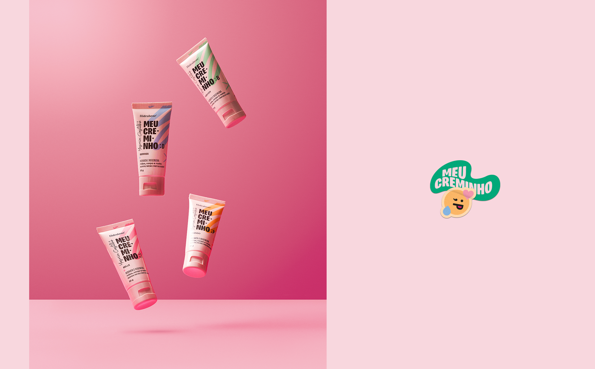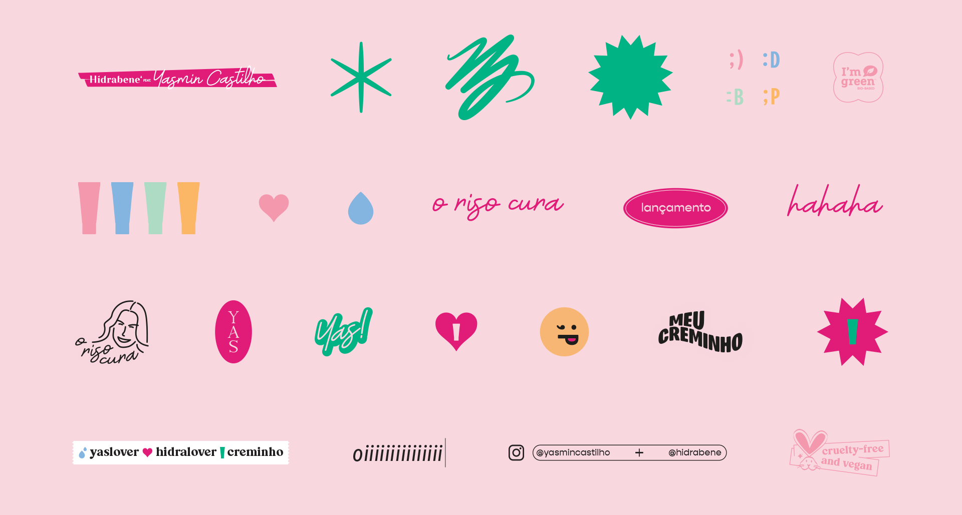 como emojis, simulações de risadas, reproduções de frases utilizadas pela influenciadora e claro, tudo isso sem deixar de lado o principal fator de reconhecimento da marca Hidrabene no ponto de venda, a cor rosa.